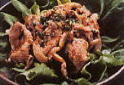 た肉を@に30分位漬け込む。C器にサラダ菜を敷いてBを盛り、小口切りにした小ねぎと炒りごまを振る。